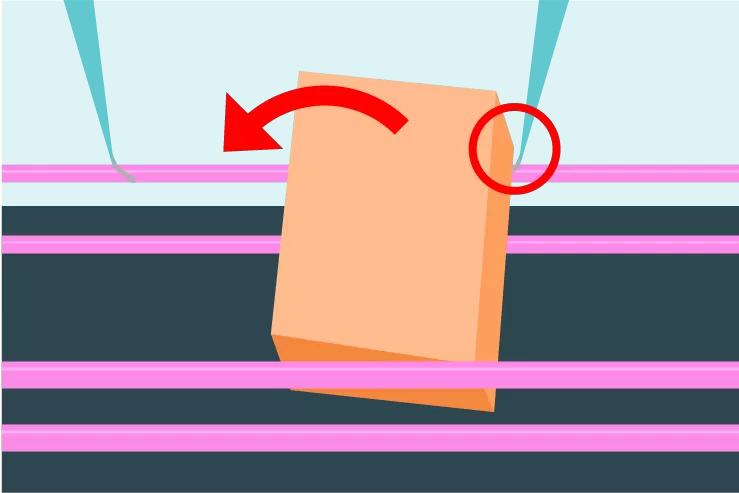 手前の接地面が小さくなったときに、すき間の対角の奥角を片アームで狙うと、奥が持ち上がり接地点が外れて落ちてくれます。